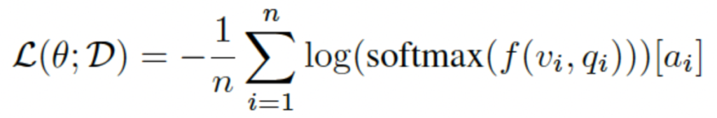 Figure2에서 볼 수 있듯이, VQA는 classification task라고 볼 수 있이 때문에 $n$ 크기의 데이터셋에 대해 cross-entorpy criterion을 최소하하는 것으로 loss가 구성됩니다.