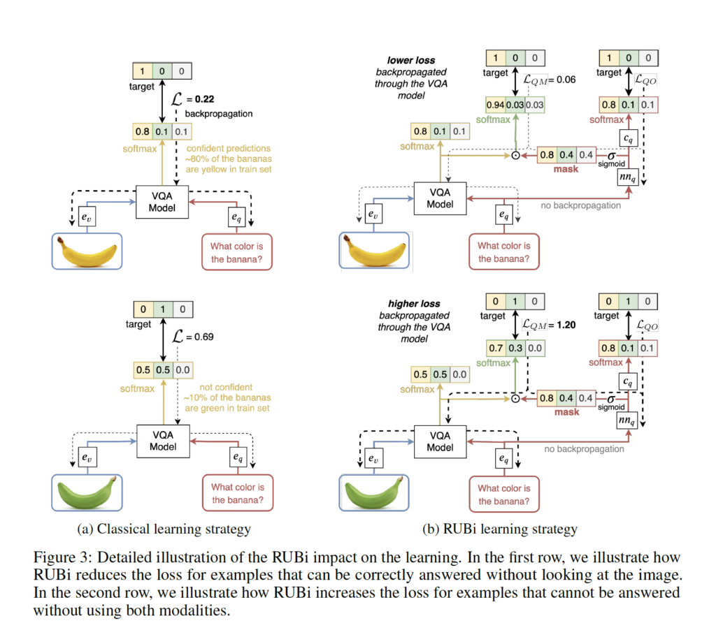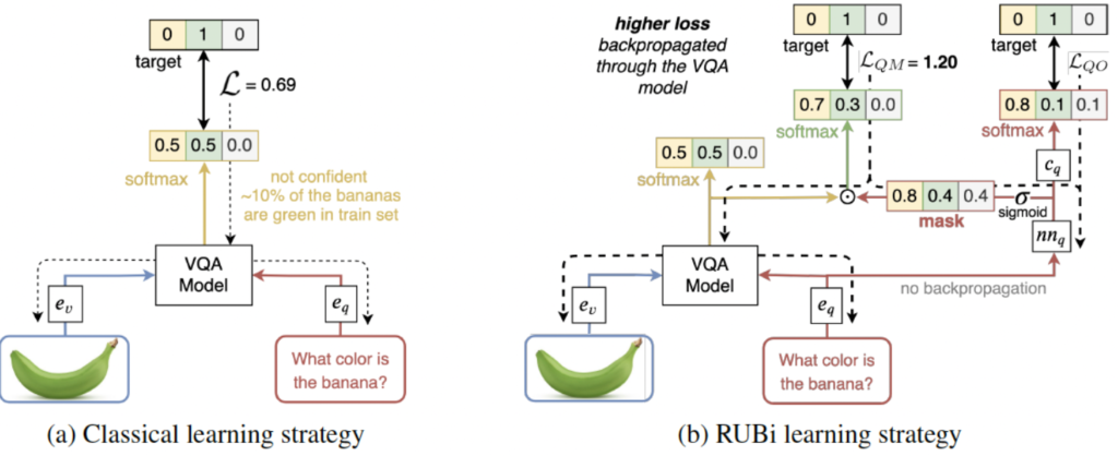 첫 번째로, 가장 편향된 예제, 즉 image modality를 사용하지 않고도 올바르게 분류할 수 있는 example의 중요성을 줄입니다. 이를 위해서 question-only branch는 정답의 score를 높이고 다른 정답의 score를 낮추는 mask를 출력합니다. 위의 그림을 보면서 따라오시면 더 이해가 쉬울 듯 합니다. 결과적으로 위의 example과 같이 biases된 example에서 loss가 훨씬 낮아집니다. 즉, 결과적으로 VQA 모델을 통해 backpropagated되는 gradients이 더 작아져 training에서 이러한 example에 대한 중요도가 낮아집니다. 위의 그림을 보시면 ‘what color is the banana’라는 질문이 주어졌을 때, mask는 training set에서 이 질문에 대한 가장 가능성이 높은 yellow answer에 대해 0.8이라는 mask를 취합니다. 반면에 다른 answer인 green과 white의 값은 더 작은 것을 확인할 수 있는데요. mask가 VAQ 모델에 영향을 미쳐 yellow answer과 관련된 점수가 0.8에서 0.94로 증가하는 새로운 prediction을 생성하는 것을 볼 수 있습니다. RUBi를 적용하지 않은 학습 방식에 비해서 RUBi를 사용하면 loss가 0.22에서 0.06으로 감소하는 것을 확인할 수 있습니다.