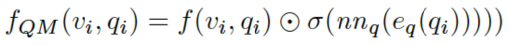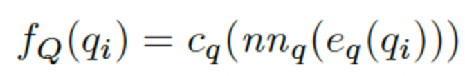 question-only branch는 $f_Q : Q → \mathbb{R}^{|A|}$로 표현할 수 있는 있는데, question encoder $e_q : Q → \mathbb{R}^{n_q\times{d_q}}$ ($d_q$ dimension의 $n_q$ 벡터 set을 output으로 가짐), neural network $nn_q : \mathbb{R}^{n_q\times{d_q}} → \mathbb{R}^{|A|} $그리고 classifier $c_q : \mathbb{R}^{|A|} → \mathbb{R}^{|A|}$로 구성되어있습니다. 식으로 표현하면 아래와 같이 표현될 수 있습니다.