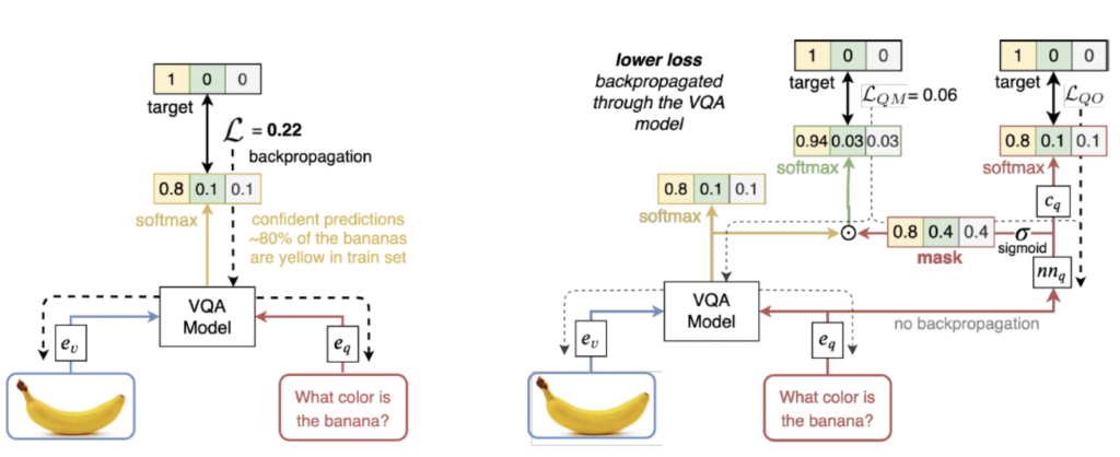 두 번째로, 두가지 modality를 모두 사용하지 않고는 답할 수 없는 example의 중요성을 높였습니다. 이러한 example의 경우 question-only branch는 오답의 점수를 높이는 mask를 취합니다. 결과적으로 loss가 더 커지고 VQA 모델이 이러한 예제에 대해서 학습하도록 권장되게 됩니다. 위의 그림을 보면 loss가 0.69에서 1.20으로 증가한 것을 확인할 수 있습니다.