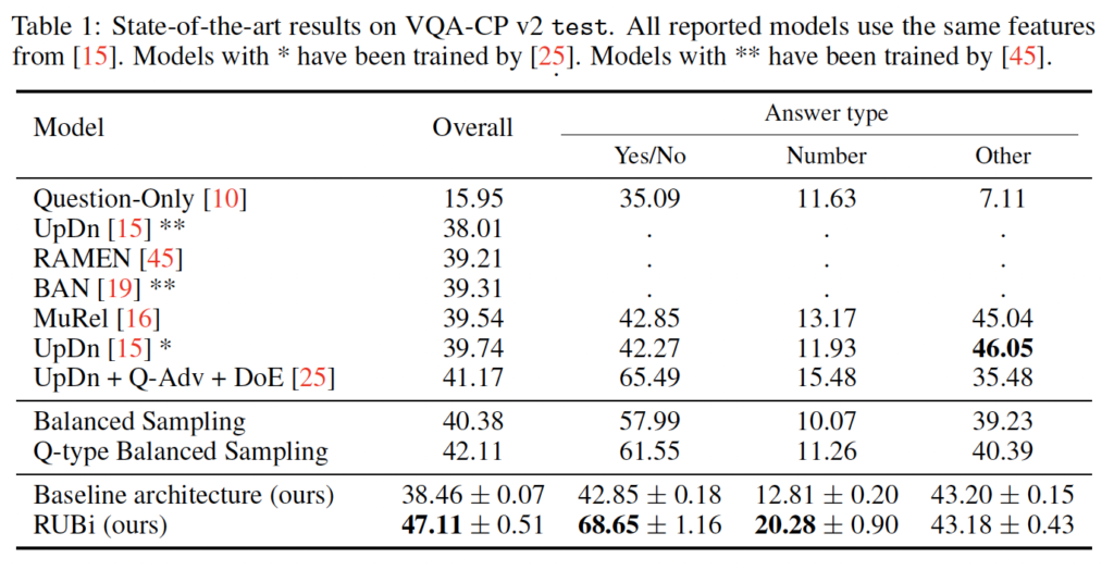 Table 1을 보면 baseline에 RUBi로 학습시킨 것이 SOTA를 달성한 것을 볼 수 있습니다. 앞전에 introduction에서 말씀 드린 것처럼 train과 test의 answer 분포가 다른 데이터셋인 VQA-CP2에서 SOTA를 달성하였습니다.