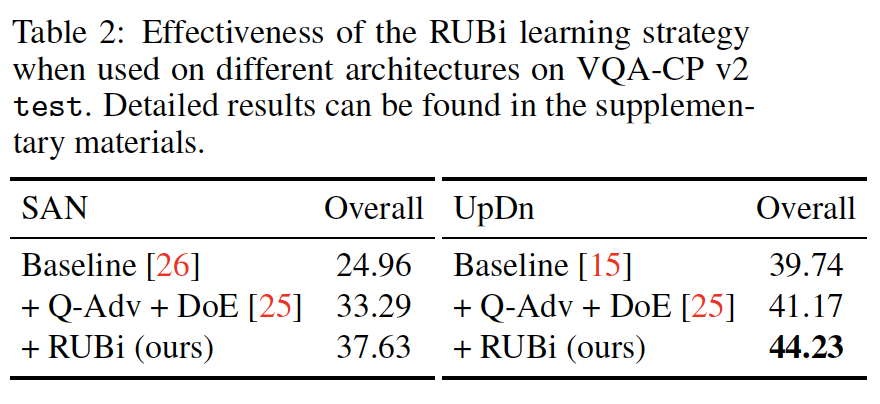 RUBi는 기존의 architecture를 변경하지 않고도 VQA 모델에 적용할 수 있는데요. Table 2에서는 두 가지 추가 architecture인 Stacked Attention Networks (SAN)[26], Bottom-UP and Top-Down Attention(UpDn)[15]에 대한 결과를 보여줌으로써 RUBi가 architecture agnostic하다는 것을 입증하였습니다. 성능을 보면 확실히 RUBi를 적용했을 때 유의미한 성능 향상을 이룬 것을 확인할 수 있습니다.