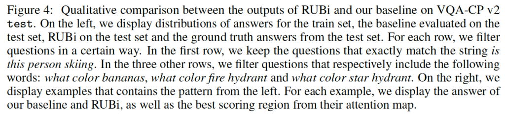 다음은 이 논문을 읽으면서 가장 흥미로웠던 부분이었는데요. train에서 yes 밖에 없었는데 보통의 모델이라면 당연히 yes라고 대답할 것을 RUBi를 이용하면 No라고도 대답할 수 있음을 보인 것이 굉장히 흥미로웠습니다. 심지어 학습에 없던 질문이 들어와도 대답을 잘 하는 모습을 보면 RUBi 학습 전략이 간단하면서도 확실히 bias를 줄일 수 있는 방법론이구나 나는 것을 느낄 수 밖에 없었던 것 같습니다.