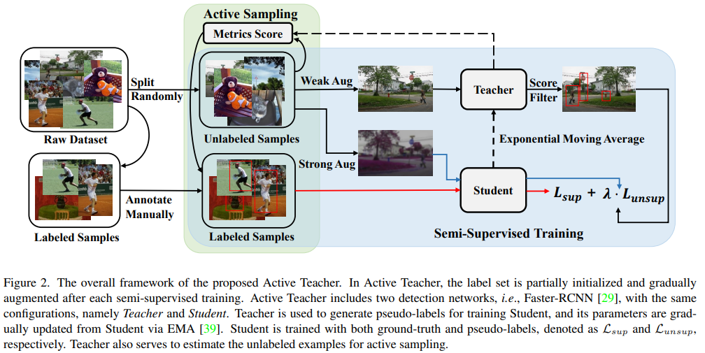 active teacher 의 오버뷰. 본 논문의 오버뷰는 간단하다. 왼쪽에서 부터 화살표를 따라가면 된다. 소량의 labeled pool과 raw 데이터의 일부를 통해 student model을 학습하고 Exponential moving average(EMA가 더 익숙할지도 모른다) 방법을 통해 student의 지식을 teacher에 전이시킨다. 이후 teacher model을 활용하여 active sampling을 통한 labeled pool을 보충한다. 위의 과정을 의도한 k 번 만큼 반복하는것이 오버뷰의 전부이다.