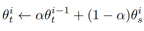 또한 teacher 모델도 student 모델의 학습이 끝나면 업데이트가 되는데, 이는 Exponential Moving Average(EMA) 방식을 이용합니다. 수식은 아래 수식2와 같습니다. EMA를 처음 보시는 분은 업데이트 된 student의 파라미터를 teacher network에 반영하되, 급격한 변화를 막기위해 a 가중치 만큼 기존 파라미터(θt)를 보존하여 업데이트하는 것으로 이해하시면 됩니다.