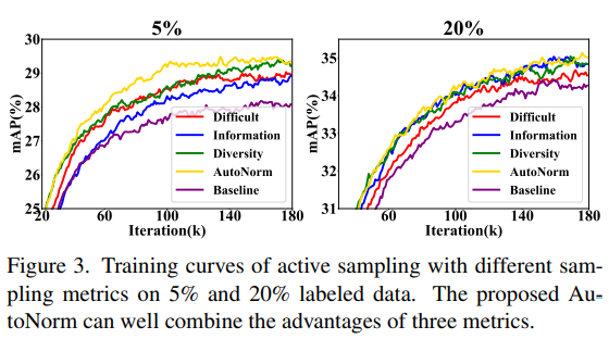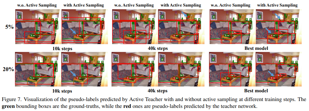 마지막으로 정성적 성능입니다. Figure 6은 각 지표에 대한 ablation study 결과의 확장으로 보시면 되고, 더욱 중요한 그림은 아래의 figure7입니다. figure 7에서 녹색박스는 이미지 내 ground truth이고 붉은 박스가 teacher network로 예측한 결과 입니다. 전체적으로 w.o active sampling 결과가 with active sampling 결과에 비해 ground truth box와 유사하며 그림 내부의 파란색 화살표로 강조했듯이 작은 object에 대해서도 더욱 정확한 예측을 했음을 보입니다. 해당 결과를 통해 localization과 classification 퍼포먼스 모두가 개선되었음을 짐작할 수 있습니다.