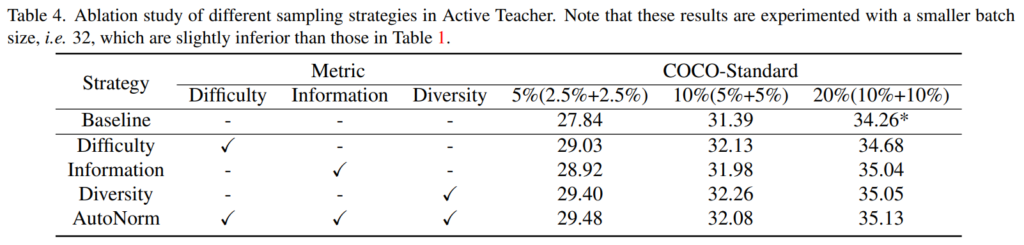 3. 마지막으로 Difficulty, Information, Diversity 방법론 모두를 적용한 AutoNorm과 그냥 Diversity 하나만을 사용하는 것과 성능 차이가 거의 나지 않는 것 같습니다. (오히려 10%의 경우에는 Diversity 단독으로 사용하는 것이 더 좋기도 하구요.)