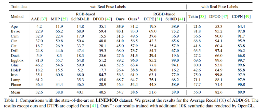 - 저자들에 따르면, 3D pose annotation과 depth 정보를 사용하지 않고 RGB 이미지에서 object pose를 추정한 것은 저자들이 처음이었으며, 단순히 합성 데이터를 이용한 방법론들과 비교했을 때 더 우수한 성능을 보임