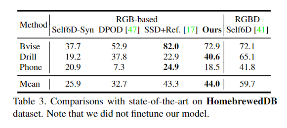 Self6D는 homebrewedDB에서 모델을 재학습하였으며, Self6D-Syn은 합성 RGBD 데이터만을 이용하여 모델을 학습한 버전입니다. Table 3을 통해 HomebrewedDB에 대한 결과를 확인할 수 있으며, 마찬가지로 RGB 이미지만을 이용하는 방법론들과 비교했을 때, 가장 좋은 성능을 보이는 것을 확인할 수 있습니다.
