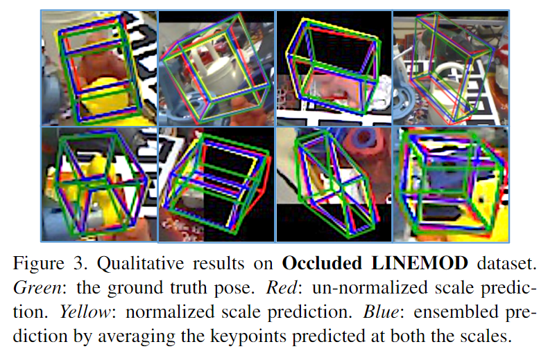 아래의 Table 2에서 결과를 확인할 수 있으며, RGB 기반 방법론들과 비교했을 때는 가장 좋은 성능을 보이는 것을 확인할 수 있습니다. 여기서 Self6D-LB는 depth 정보를 이용하지 않는 Self6D입니다. 추가로 아래의 Figure 3을 통해 Occluded LINEMOD에서 정성적 결과를 확인할 수 있습니다. 시각화한 결과는 occlusion이 발생한 경우에 대한 시각화 결과로, 초록색은 GT, 빨강과 노랑은 두 스케일의 예측 결과, blue는 두 결과를 앙상블(평균을 이용함)하여 구한 pose 예측 결과입니다.