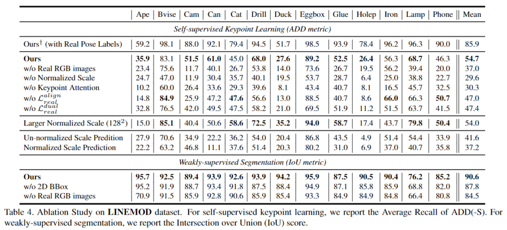 아래의 Table 1에서 결과를 확인할 수 있으며, 합성 데이터만을 이용할 경우 LINEMOD에서 성능이 크게 하락합니다.(합성데이터는 LINEMOD를 렌더링한 데이터임) 이를 통해 합성 데이터와 real 데이터 사이에 domain gap이 있다는 것을 확인할 수 있습니다. 또한, Depth 정보를 이용할 수 있으면 pose 예측 성능이 개선되는 것을 확인할 수 있습니다.