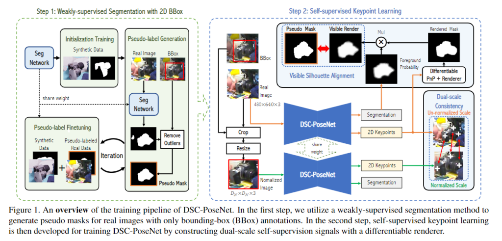 본 논문은 기존 연구들이 많이 사용하는 keypoint 기반의 pose estimation 방식을 이용합니다. pose를 추정하기 위해 2D-3D correspondence를 구하고 PnP 알고리즘을 이용하여 pose를 추정하는 방식이지만, 해당 방법론은 3차원 GT Pose가 없으므로 real 데이터에서는 실제 keypoint 위치를 알 수 없습니다. 따라서, 저자들은 keypoint의 위치를 예측하기 위해 self-supervised dual-scale consistency pose estimation 방법론인 DSC-PoseNet을 설계하였습니다. 추정된 keypoint를 이용하여 pose를 예측하는 방식으로, 정규화된 scale과 정규화되지 않은 scale 모두에서 keypoint를 예측하며, 두 scale의 keypoint의 일관성을 갖도록 학습을 시킵니다.