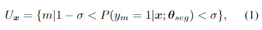 합성 데이터를 이용하여 초기화된 segmentation 네트워크를 이용하여 전체 real 데이터에 pseudo mask를 구합니다. 이때, BBox를 이용하여 배경 영역이 전경으로 예측되는 outlier를 제거하고 fine-tuning을 수행합니다. 그 다음 낮은 신뢰도를 갖는 픽셀은 불확실한 픽셀로 설정하여 loss를 계산할 때 영향을 주지 않도록 합니다. x는 이미지, y는 segmentation map이라 할 때, m∈\{ 1, ... ,M \}은 불확실한 픽셀 집합으로, 아래의 식(1)으로 정의한 것입니다.