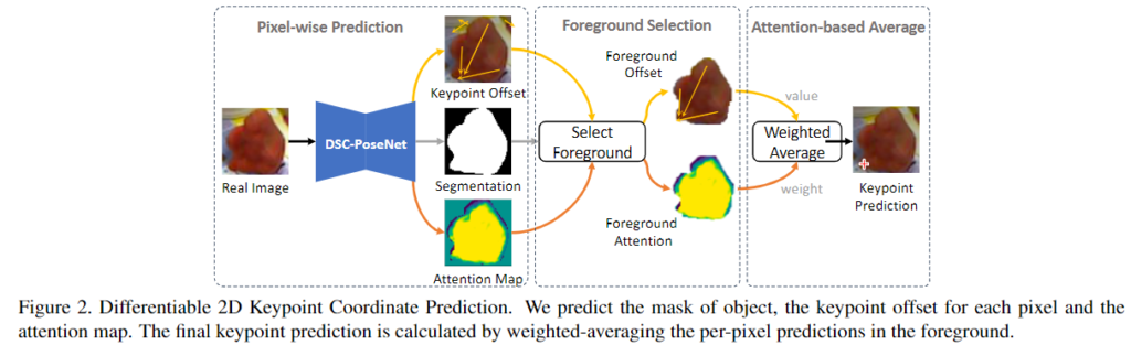 이를 해결하고자 2D keypoint 좌표를 regression하는 방법을 제안합니다. 과정은 Figure 2에 도식화 되어 있으며, 각 2D keypoint k_n(n=1, ..., N)와 m 위치에서의 각 object 픽셀의 좌표 p_m에 대해 DSC-PoseNet은 attention 가중치 a_{nm}를 생성하고 keypoint offset \Delta k_{nm}를 예측합니다. 이렇게 예측된 keypoint \tilde{k}_{n}은 아래의 식으로 나타낼 수 있습니다.