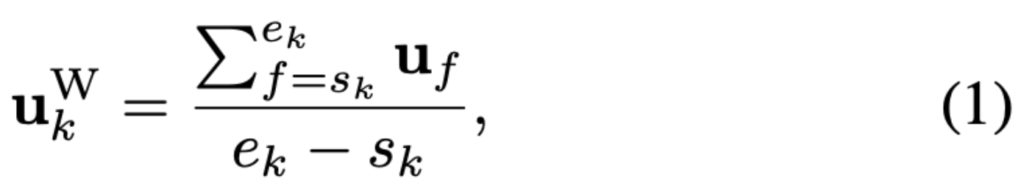 여기에서 $u_k^W$는 word-level speech embedding $U^W$의 $k^{th}$ segmentation을 의미하고, $u_f$는 frame-level speech embedding의 $f^{th}$ frame을 의미합니다. $s$는 starting frame, $e$는 end frame을 의미합니다.