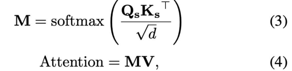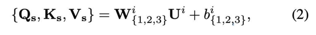 $U^i$는 $i \in {W,T}$ modality에 대한 embedding을 말하고, $W$는 word-level speech embedding, $$T$는 text embedding을 말합니다. $W$는 weight, b$는 bias를 말합니다. self-attention module에서, 식 2에 있는 i 는 $Q_s, K_s, V_s$에 대해서 동일합니다. 따라서 아래와 같이 처리된 embedding을 얻을 수 있습니다.