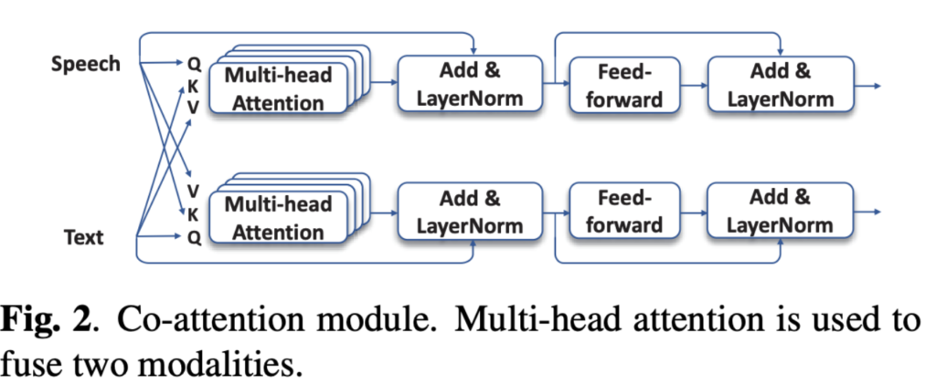 co-attention module은 Fig 2를 통해 확인할 수 있는데요. co-attention module에는 두 개의 branch가 있으며, 각 branch는 Transformer encoder와 동일한 구조를 가지고 있습니다. 두 가지 modality의 첫번째 embedding은 각각 multi-head attention으로 보내집니다. $Q_c, K_c, V_c$의 계산은 식 2와 같습니다 하지만 여기서는 각 branch마다 $Q_c$ 또는 $K_c, V_c$와 같이 다른 modality를 가집니다. 그런 다음 식 3을 사용하여 attention map을 계산합니다. multi-head attention의 output은 식 3를 이용하여 계산되고 그런 다음 input과 함께 추가되어 $Q_c$를 계산하는 데 사용됩니다. 모델이 수렴하는데 도움이 되도록 Layernorm layer가 추가됩니다. 그런 다음 feed-forward layer가 적용되며, 비선형 함수가 있는 두개의 linear layer로 구성됩니다. feed-forward layer의 output은 input과 함께 추가되고 LayerNorm이 적용됩니다. Co-attention moduel은 여러번 적용할 수 있는데요. output은 최종 co-attention module의 두 개의 branch의 mean 입니다.