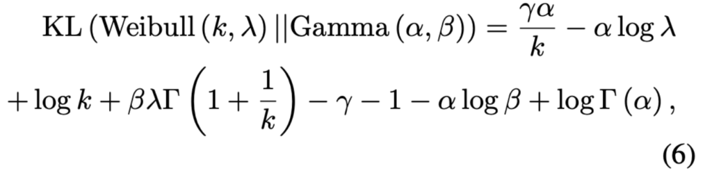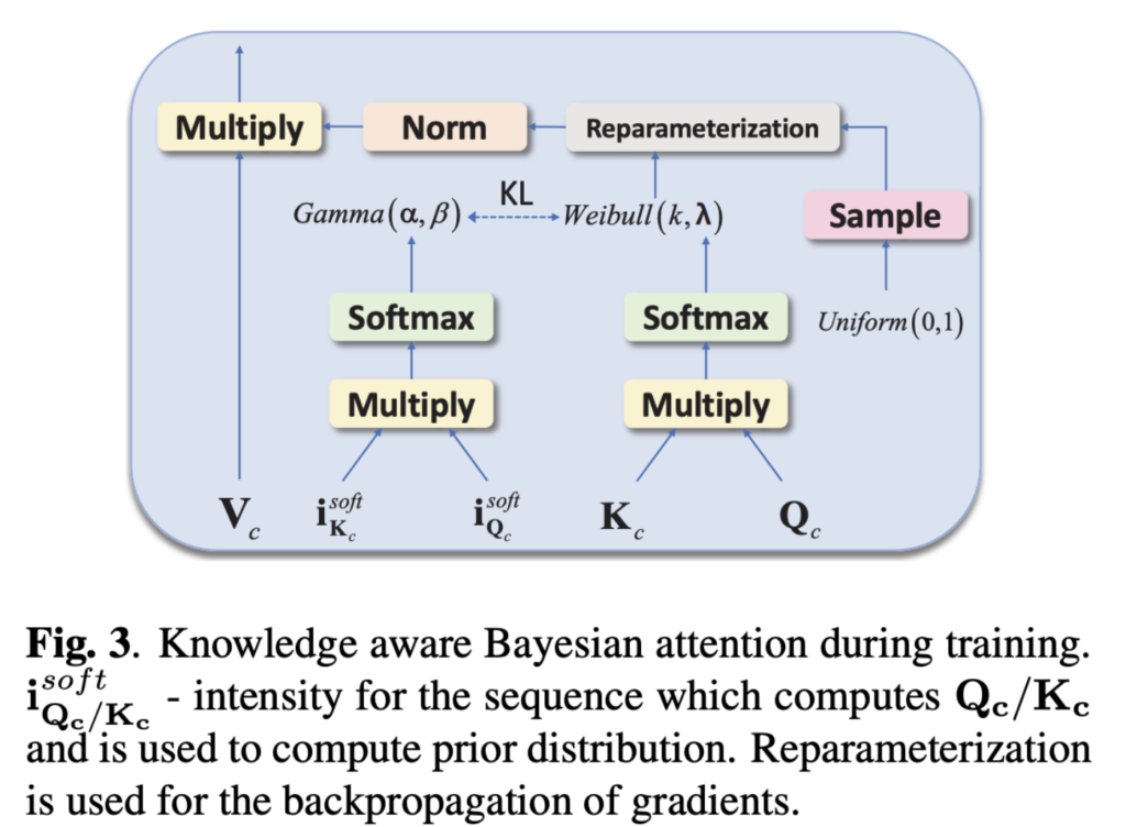 제안된 Knowledge-aware Bayesian Co-attention Module은 Fig 3에 표시된 식 3의 attention map 계산을 제외하고는 2.3 section의 co-attention module과 동일한 구조를 가집니다. BAM [16]에서 attention weight $W$는 deterministic하지 않고 variational distribution에서 data-dependent하는 local random variable 입니다. 이 variational distribution은 reparameterizable한 attention distribution과 정규화로서의 prior를 사용하여 attention weight $W$를 posterior로서 근사치를 구할 수 있음을 보여주었습니다. [16]에 따라 Weibull distribution를 variational distribution로, Gamma distribution을 prior distribution으로 사용하면 regularization KL은 다음과 같이 계산할 수 있습니다.