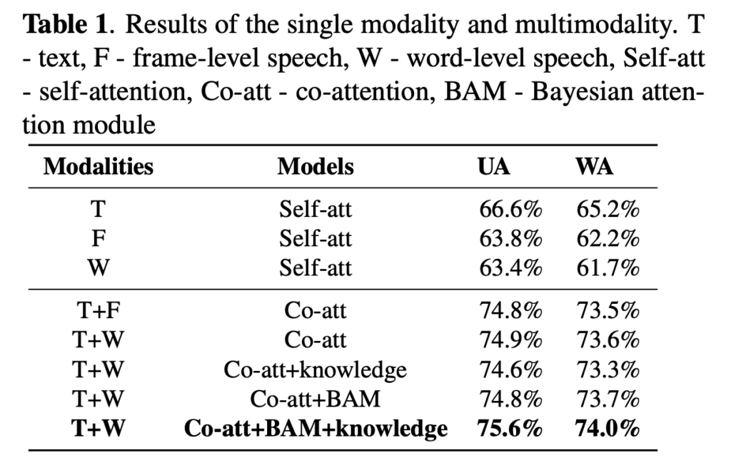 Table 1의 앞단은 single modality의 결과를 보여주는데요. co-attention이 없다는 점을 제외하면 Fig 1의 one branch와 구조가 동일합니다. word-level speech embedding은 식 1을 사용하여 frame-level speech embedding으로부터 계산됩니다. Text modality가 성능이 가장 좋은 것을 확인할 수 있습니다. 논문의 저자는 이에 대한 이유로 IEMOCAP에서는 음성이 더 효과적인 복잡한 상황이 많지 않기 때문이라고 합니다.