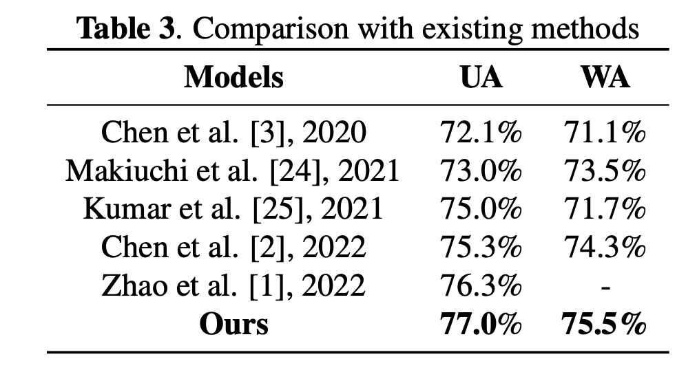 자체적으로 성능 향상을 이룬것보다 다른 모델에 비해서 얼만큼 성능 향상을 이루었는지가 중요한데 Table 3를 통해서 이를 확인할 수 있습니다. SOTA multimodal emotion recognition 방법들과 비교했을 때 SOTA를 달성한 것을 볼 수 있고 UA가 0.7이상 향상한 것을 확인할 수 있습니다.