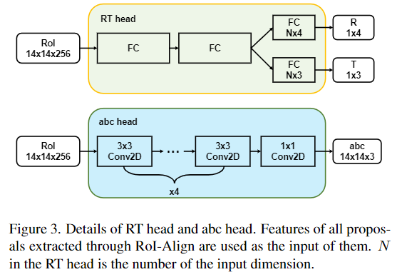 본 논문은 RT matrix와 3D 모델의 point를 예측하기 위해 RT head와 abc head를 제안하였습니다. R은 쿼터니안 형태의 rotation matrix, T는 translation matrix이며, RT head와 abc head를 mask R-CNN에 추가하여 RoI-Align을 통해 추출된 모든 RoI feature를 입력으로 사용합니다. Figure 3는 이 두 head를 도식화한 것으로, RT head는 RT matrix를 구하기 위해 2개의 shared FC layer와 2개의 독립적인 FC layer로 구성되며, abc head는 3D Point cloud를 출력하기 위해 4개의 3×3 Conv layer와 1개의 1×1 Conv layer로 이루어진 FCN 구조(fully convolutional network 구조로, FC layer를 이용할 경우 공간적 정보가 소실되고 입력 크기가 제한된다는 문제를 해결하고자 모든 레이어를 convolution 레이어로 표현한 것입니다)로 이루어져있습니다.