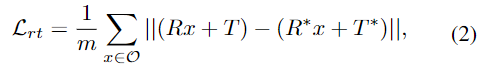 mask R-CNN의 classification, detection, segmentation loss function에, 본 논문에서 제안한 RT head와 abc head에 대한 2가지 loss가 추가됩니다. 먼저 RT head의 loss \mathcal{L}_{rt}는 아래의 식 (2)로 정의됩니다. 참고로 식(2)는 pose 정보에 대한 손실함수로 많이 사용되는 loss로, 3D 모델의 각 vectex에 GT pose와 예측 pose를 적용하여 이동시킨 뒤, 거리를 측정하는 방식입니다.