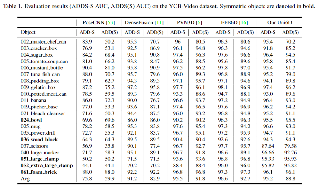 1. Evaluation results on YCB-Video dataset