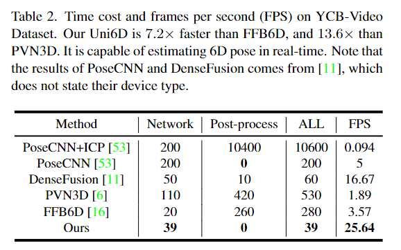 본 논문은 단순한 파이프라인으로 이루어졌으며, 후처리 과정을 거치지 않는다는 점도 포함하여 inference 속도에 큰 강점이 있습니다. 아래의 Table 2에서 다른 방법론과의 비교를 확인할 수 있습니다. 후처리과정은 FFB6D에서는 전체 시간의 92.9%, PVN3D에서는 79.2%의 시간을 차지할 만큼 시간이 많이 소요되는 과정입니다. 이를 줄임으로써 Uni6D는 FFB6D에 비해 7.2배, PVN3D에 비해 13.6배 더 빠른 속도를 달성하였습니다.
