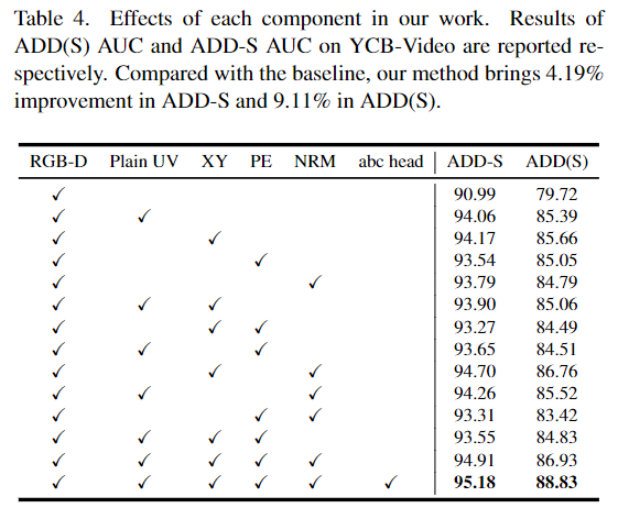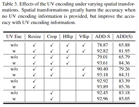아래의 Table 3은 projection breakdown 문제에서 UV encoding이 영향을 확인하기 위한 실험 결과로, YCB-Video에 대해 spatial transformation을 수행하여 성능을 확인한 것입니다. random resize, crop, horizontal flip, vertical flip과 같이 공간적인 변형을 주는 증강방식을 사용할 경우, ADD-S가 최대 15%, ADD(s)는 최대 20% 성능이 감소합니다. 이를 해결하기 위해 저자들은 하나의 백본으로 모든 것을 해결할 수 있도록 UV encoding 정보(UV,XY,PE)를 추가하였습니다. 표를 보시면 UV Encoding을 사용하였을 때 성능이 개선되는 것을 확인할 수 있습니다.