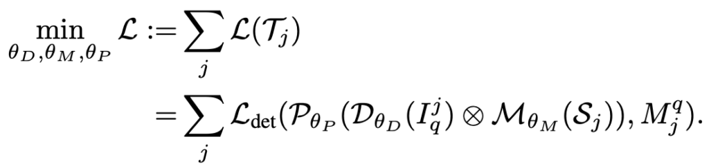 두 학습 단계에서, Reweighting 계수는 랜덤하게 샘플링된 입력 영상에 의존적이게 되는데, 그로 인해 랜덤에 의한 변화성을 낮추고자 한 Episode learning 이후 해당 파라미터를 토대로 다음 Episode learning을 진행하는 것이 아니라, 각각 랜덤하게 샘플링하여 실험한 뒤 Reweight 계수 (Vector)를 평균하는 방식으로 사용했습니다. 그렇다면, 전체 Base set을 학습한 것과 유사한 효과를 볼 수 있고 또한 파라미터를 건드리는 일이기 때문에 (논문 제목이 왜 Feature Reweighting인지 보여주는 것 같습니다), Inference 시에는 해당 모듈을 제거해도 충분하겠죠. 다음은 Detection loss 입니다.