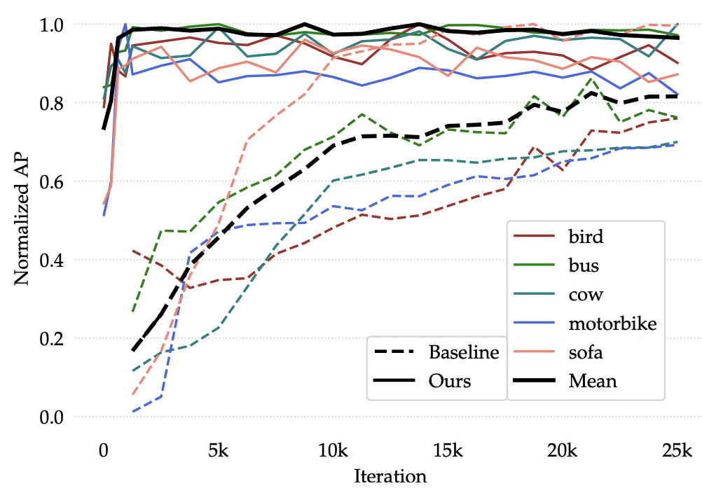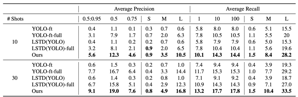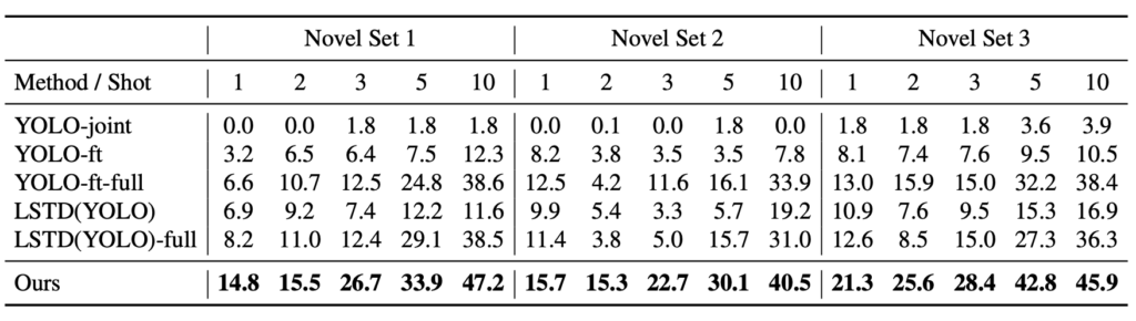 그래프를 잘 살펴보면, 클래스 별 AP가 얼마나 빠른 속도로 수렴하는지가 중요시 여깁니다. 모든 클래스에 대해 AP가 높은 것은 아니지만 (sofa의 경우), 굉장히 중요한 점은 모든 클래스에 대해 Baseline (Yolo2-ft-full)에 비해 수렴 속도가 굉장히 빠르다는 점이죠. 저자는 이 점을 짚으며, 수렴까지 가는 학습 속도도 중요하다고 봅니다. 왜냐하면, 다른 여타 학습 방법과는 달리 Few-shot detection은 적은 샘플 몇가지를 가지고 바로 학습 시켜서 실제 사용하는 것이 Application 측면에서 주 목적인데, 수렴이 오래 걸린다면 Online-deep learning이 힘들겠죠.