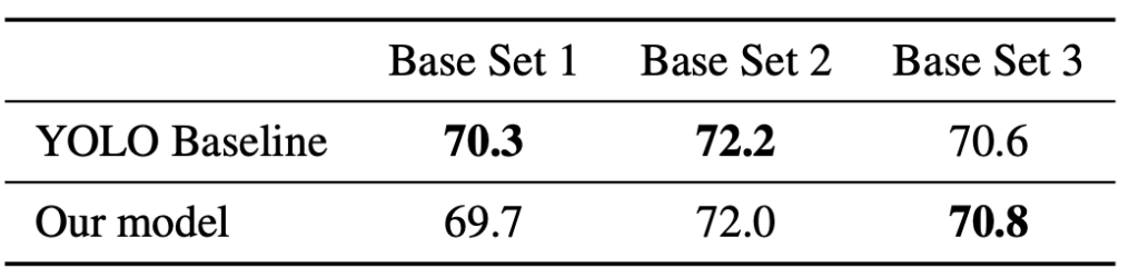 위는 Base set에 대해 Train/Test를 거친 실험입니다. 저는 중요하게까진 보고 있지 않지만, 저자의 말을 빌리자면 Baseline 대비 일반적인 detection 성능도 좋다는 것을 말합니다. 만, 사실 Yolo의 백본 및 구조를 그대로 들고 왔는데, 이 성능이 괜찮다는 것을 언급한 것은 어떤 고찰을 얻을 수 있는지는 모르겠습니다. 다양한 Ablation study를 더 살펴보죠.