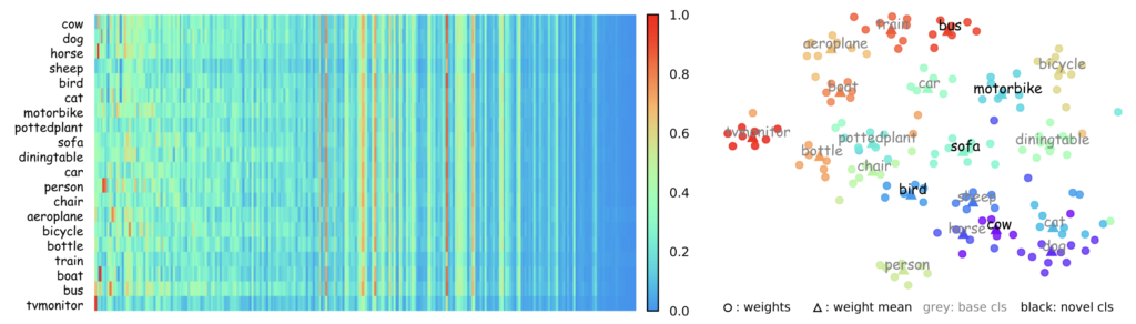해석하기 굉장히 어려운 그래프입니다. 왼쪽 그래프는 Reweight coefficients를 시각화한 모습으로, 계수는 meta-feature를 어떻게 사용할 것인지를 판단하고 그러므로 detection 성능에 중요합니다. 시각화된 자료를 살펴보면, column들은 Feature를 매핑하여 수로 표기한 것인데 저자는 중간을 기준으로 클래스들이 중간의 왼쪽 부분은 각자 다른 모습을, 오른쪽 부분은 비슷한 모습을 보이는 것을 보아 (왼쪽이 조금 더 클래스를 가로짓는데에 중요히 여겨진 부분), Meta-feature가 적절히 학습되었다는 것을 보여줍니다. (오른쪽이 유사하므로) 이는 왼쪽에 보이는 것과 같이 class-specific한 Feature를 갖도록 수렴하는데 시간이 적게 걸리는 것과도 연관성은 있겠네요 (물론 추론 시간은 현 그래프가 아닌 위의 수렴 속도 그래프를 참고해야하지만)