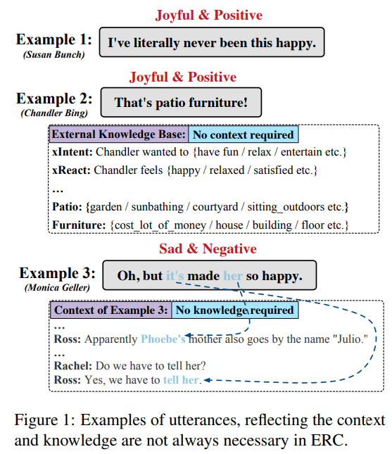 특히, knowlege-sensitive ERC 모델에서는 주로 두 가지 종류의 external knowledge가 있습니다. 하나는 external knowledge 기반 ConceptNet 또는 SenticNet에서 가져온 concept입니다. 다른 하나는 pre-training commonsense transformers (COMET)에 의해서 생성된 concept입니다. 또한, context-sensitive ERC 모델에서는 최근 연구에서 memory network 및 graph-based 모델 등 다양한 방법을 제안했습니다. 하지만, 이러한 연구는 모델에 현재 발화에 대한 context와 external knowledge가 필요한지 여부를 따르는 것이 아니라 모델링하는 방법을 개선하는데 중점을 둡니다. 조금 더 예시를 들어보겠습니다. Fig 1을 보시면, Example1의 감정은 context와 external knowledge를 활용하지 않고도 직관적으로 감정을 인식할 수 있습니다. Example 2(context-independent)는 대화의 첫 번째 발화로 context가 없는 발화입니다. 이 문장에서 감정을 인식할 때 patio furniture와 ‘joy’ 사이의 관계를 미리 알고 있지 않다면 감정을 인식하기가 어려울 것입니다. Example 3 (knowledge-independent)의 경우, 발화의 문자 그대로의 의미가 전달된 감정과 반대를 띕니다. 따라서 context가 없으면 발화의 감정을 정확하게 인지하기 어렵습니다. 이렇게 위의 예시들이 존재하지만 context나 external knowledge가 제거하는 경우, 발화 represnetation 간의 semantic gap이 발생합니다. 따라서 context-, knowledge-independent 발화를 다른 발화와 구별하는 방법은 매우 어려운 과제라고 말할 수 있습니다.