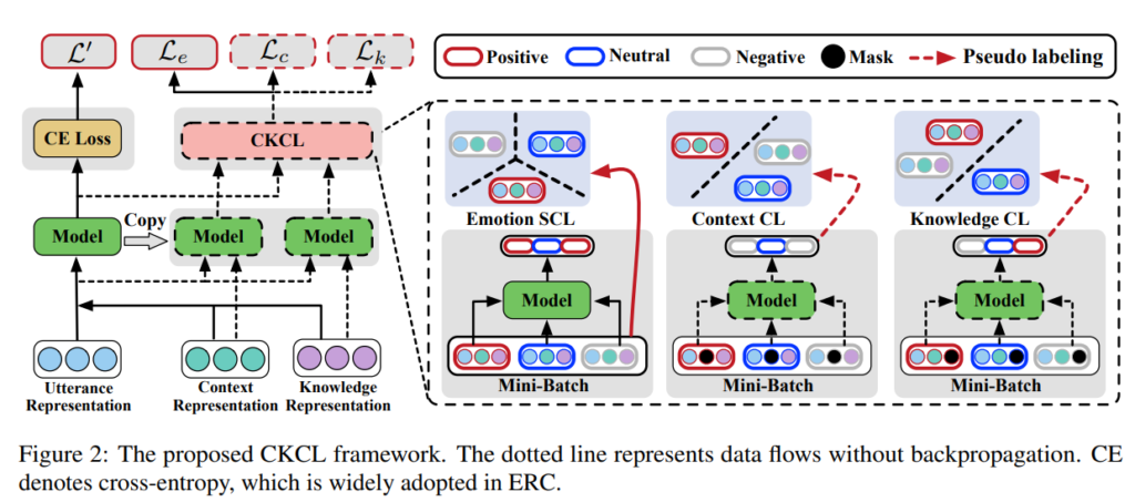 CL은 visual representation을 개선하기 위해 data를 augment하기 위해 처음 제안되었습니다. 이후 semantic text similarity task에서 BERT의 성능이 좋지 않은 것에서 영감을 받아 연구자들은 발화 간의 상관관계와 차이를 포착하기 위해 self-supervised CL을 도입하기 시작했습니다. 그 후 NLP 분야에서 점점 더 많은 CL 기반 방법이 등장하기 시작했는데요. 안타깝게도 ERC 분아에셔 unsupervised CL을 기반으로 한 관련 연구는 아직 없다고 합니다. 이 세션에서는 context와 external knowledge를 모델링할 때 ERC 모델의 성능이 저하되는 점을 감안한하여 학습 중에 발화 representation을 개선하기 위해 CL 기반 framework인 CKCL을 소개합니다. 또한 Li et al. (2022a)에서 영감을 받아 weighted supervised CL을 CKCL에 통합하여 고르지 않은 분포 샘플을 구별하는 것 또한 진행합니다.