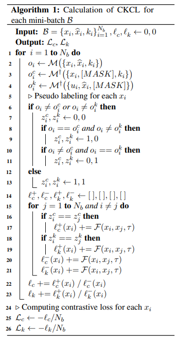 논문의 저자는 이를 기반으로 context-independent, context-dependent 발화 간의 상관관계와 차이를 포착하기 위해 context CL을 설계하였습니다. 먼저 모델 M을 복사하여 각 mini-batch $B$에 대한 복제 모델 $M†$에 $u_i$의 context reprsentation $\hat{x_i}$를 0으로 masking한 input data ${x_i, [MASK], k_i}_{i=1}^{N_b}$를 feed 합니다. 그런 다음 Algorithm 1의 $Line 6 – Line 12$로 표시되는 self-supervised pseudo labling을 수행합니다. 마지막으로, Algorithm의 $LIne 14 – Line 24$에 설명된 pseudo labels $z^c = {z_i^c}^{N_b}_{i=1}$에 따라 constrastive loss item $L_c$를 계산할 수 있습니다.