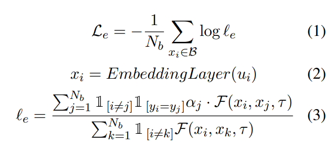여기서 $B$는 mini-batch sample을 나타내고, $N_b$는 B의 size 입니다. $\mathbb{1}_{[.]} \in {0, 1}$은 indicator function을 나타냅니다. $α_j$는 $j$번째 발화의 class weight를 나타냅니다. $EmbeddingLayer(.)$는 word embedding method를 나타냅니다. ERC 모델은 일반적으로 발화 representation을 encoding하기 위해서 BERT, Glove 또는 Roberta를 활용합니다. $\mathcal{F}(x_i, x_k, \tau) = e^{simi(x_i, x_j)/\tau}$, 여기서 $\tau$는 temperature parameter를 의미하고, $simi(x_i, x_j) = \frac{x_i \cdot{x_j}}{||x_i|| ||x_j||}$은 cosine similarity function을 의미합니다. 그리고 ${y_i}^{N_b}_{i=1}$은 B의 발화의 emotional label set을 의미합니다.