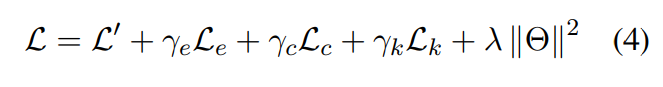 $γ_e, γ_c$와 $γ_k$는 튜닝된 하이퍼파라미터 입니다. $L’$은 classification loss를 의미합니다. $Θ$는 CKCL framework의 학습가능한 파라미터 set 입니다. $λ$는 $L_2-regularization$의 계수를 나타냅니다.