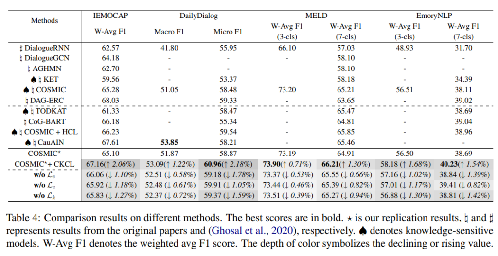Table 4를 통해서 데이터셋에서의 모델의 성능을 확인할 수 있습니다. CKCL framework에 기반한 COSMIC의 성능이 크게 향상된 것을 확인할 수 있습니다. DailyDialog 데이터셋에서 COSMIC⋆은 2.18%라는 최고의 개선 결과를 보였습니다. 또한 COSMIC⋆+CKCL은 IEMOCAP 제외한 다른 데이터셋에서 SOTA를 달성한 것을 확인할 수 있습니다.