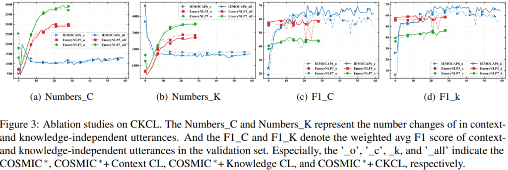 제안한 CKCL framework의 각 구성 요소가 미치는 영향을 조사하기 위해서 COSMIC⋆에 대해서 abliation study를 진행했으며, 그 결과는 Table 4를 통해 확인할 수 있습니다. ‘w/o $L_{con}$’, ‘w/o $L_{kno}$’, ‘w/o $L_{emo}$’는 각각 Context CL, Knowledge CL, Emotion SCL이 없는 경우를 나타냅니다. 결과적으로 성능을 통해서 확인해보면 Context Cl, Knowledge CL, Emotion CL이 유의미한 역할을 하는 것을 알 수 있습니다.