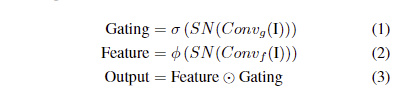 I는 영상, SN은 Spectral Normalization, \sigma 는 soft-max, \phi 는 any activation function에 해당합니다. Spectral Norm을 제외하고는 단순한 어텐션 기법으로 이해하시면 됩니다. 어찌되었든 어텐션 기법을 통해 모델은 효과적으로 각 채널 맵과 각 공간 위치에 대한 정보를 강조할 수 있게 됩니다. 따라서 어텐션 기법을 통해 추출된 로컬 정보와 주변 정보에 더 많은 주의를 기울임으로써 보다 정확한 깊이 값을 예측할 수 있습니다.