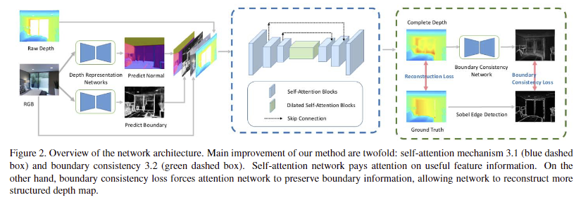 저자는 위에서 언급한 문제를 해결하기 위해서 2가지 방법을 제안합니다. 먼전, 이전 연구에서는 CNN을 이용하여 주변 정보를 전체를 활용하여 깊이 정보를 보완했습니다. 허나, 소실된 깊이 정보를 보완에 있어 어느 구역은 의미론적/기하학적으로 중요도가 상이할 수 있습니다. 그렇기에 저자는 self-attention을 이용하여 모델이 장면에서 관련이 높은 곳에 집중하도록 합니다. 이러한 기능은 위에서 언급한 방향 중 하나인 향상된 깊이 추론 정확도를 충족합니다. 마지막 방향을 충족하기 위해서 저자는 일관된 경계면을 유지하는 것으로 해결하고자 합니다. 저자는 예측된 깊이 정보로부터 추정되지 못한 영역에서의 경계면을 예측하는 네트워크를 추가로 활용하여 경계면의 일관성을 보완하도록 합니다.