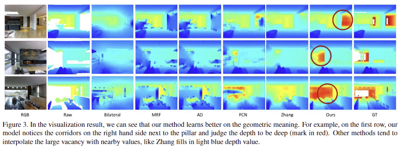 기존 딥러닝 기법들이 활용하는 CNN을 이용하는 기법들이 관측되지 않은 깊이 정보를 주변 정보를 복사하거나 보간하면서 추정하는 경향이 있다는 문제가 있습니다. 대체로 관측되지 않은 영역의 평균 깊이 값을 예측하면 loss가 급격히 감소하여 정확한 깊이 값을 예측하는 대신 쉽게 복사 및 보간을 수행하는 local minima에 빠지기 쉽습니다.