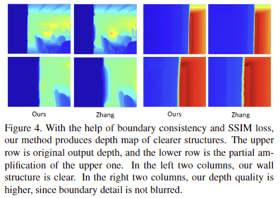 일반적인 FCN 방법론들은 위에서 언급한 바와 같이 주변 정보에 대해 복사 및 보간을 통해 깊이 이미지를 생성할 가능성이 높습니다. 이로 인해 예측된 깊이 정보의 경계과 구조가 흐린한 결과물이 나오게 됩니다. 대부분의 깊이 보완들은 회귀 문제들로 구성되기 때문에 인접한 픽셀 값이 크게 다른 날카로운 경계를 가진 깊이 맵을 생성하기 어려운 문제점이 있습니다. 저자는 해당 문제를 해소하기 위해서 명확한 경계와 구조를 학습 있는 Boundary consistency를 사용한 것을 요청합니다.
