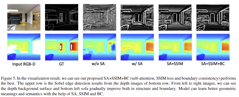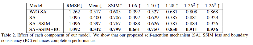 그럼, RGB, depth representations과 raw depth는 결합되어 self-attention network로 입력되어져 complete depth D를 예측합니다. 해당 네트워크는 L_SA = 1/p \in obs \sum_p \lVert D(p) - D_0(p) \rVert를 통해 손실을 계산합니다. D_0는 GT에 해당합니다. 주의해야 할 점이 D_0에서도 누락된 깊이 정보는 손실 계산에서 무시한 채로 학습을 진행합니다. 구조적인 정보를 강화하기 위한 boundary loss L_S는 SSIM을 이용하여 계산되어집니다.