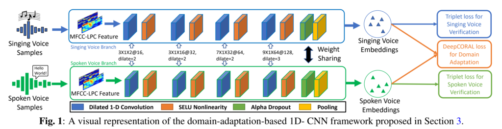 음성에서 speaker 모델링에 중요한 phoneme duration, mean fundamental frequency (F0), formant center frequency 등의 audio feature를 추출할 때, spoken voice와 sing voice, 즉, 서로 다른 speaker style에 따른 도메인 격차가 발생합니다. 따라서 저자들은 [Anurag Chowdhury and Arun Ross]의 fine-tuned 모델을 Domain-adaptation 관점으로 확장하여 기존 모델이 spoken과 singing이라는 두 도메인에의 일반성을 확보하고자 하였습니다.