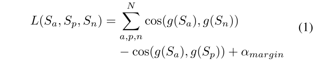 각 branch의 triplet loss는 [수식1]과 같이 정의되는데요, N개의 쌍에 대해 anchor sample과 positive sample, anchor sample과 negative sample간의 cosine similarity와 margin을 합한 형태로 구성되어 있습니다.