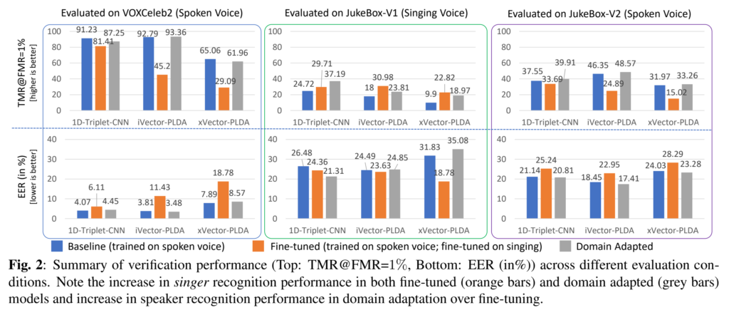 [그림2]의 결과를 보자면 모든 baseline 모델은 JukeBox 데이터셋에서 spoken에 비해 singing의 낮은 성능을 보입니다. Baseline은 spoken만으로 학습된 모델인 만큼 singing이라는 도메인으로 평가 환경이 바뀌었을 때 성능 드랍이 발생한 것입니다. Baseline 모델과 비교하여 Fine-tuned 모델은 singing에서 성능이 증가한 것을 볼 수 있지만, JukeBox-V2 와 VoxCeleb2 데이터셋의 spoken의 성능은 평균적으로 약 14%와 약 31%정도 떨어진 것을 확인할 수 있습니다. fine tuning으로 인해 원래 도메인에서의 성능 하락이 발생한 것이죠. 즉, singing으로 fine-tuning된 모델이 spoken에서의 일반화 능력이 없다는 것을 보여줍니다.