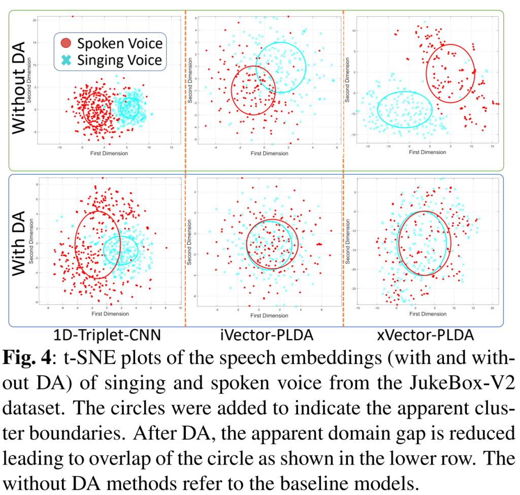 DA 없이 그리고 DA와 함께 (그림 4). 그림 4에서, DA 없이 모델에 의해 추출된 노래하는 목소리와 말하는 목소리의 임베딩은 도메인 갭의 존재를 보여주는 별도의 인지된 클러스터를 형성합니다. 그러나, DA가 있는 모델에서는 인지된 클러스터의 중첩이 눈에 띄게 증가하고 도메인 갭이 줄어들었음을 나타냅니다. DA와 non-DA 모델 간의 음성 임베딩 클러스터의 이 차이는 DA를 수행하기 위해 사용된 CORAL+ 및 DeepCORAL 손실의 직접적인 영향이라고 우리는 가설을 세웁니다. DA는 두 말하기 스타일의 음성 임베딩 간의 공분산을 최소화하여 클러스터를 병합하고 도메인 갭을 부분적으로 연결합니다.