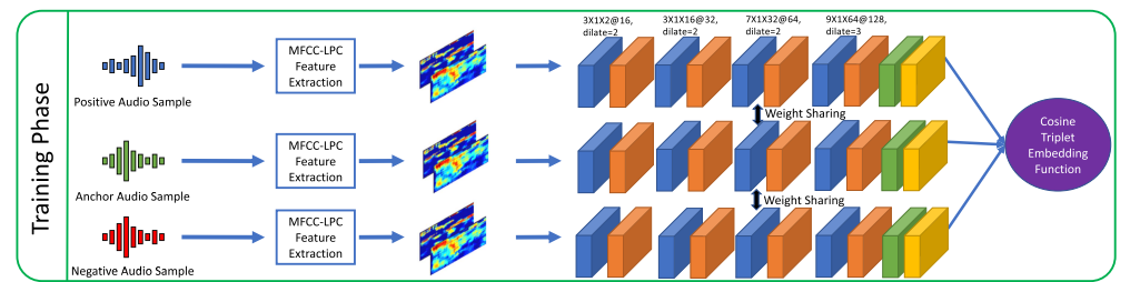 [그림1]은 논문에서 주장하는 SR모델인 domain-adaptation-based 1D-CNN의 pipeline입니다. 전체 구조를 살펴보자면 가중치가 공유되는 두 개의 동일한 1D-CNN branch로 구성되어 있습니다. 각 branch는 MFCC-LPC (audio signal의 hand crafted feature)를 CNN에 입력하여 feature vector를 추출한 다음 adaptive triplet mining에 사용됩니다.
